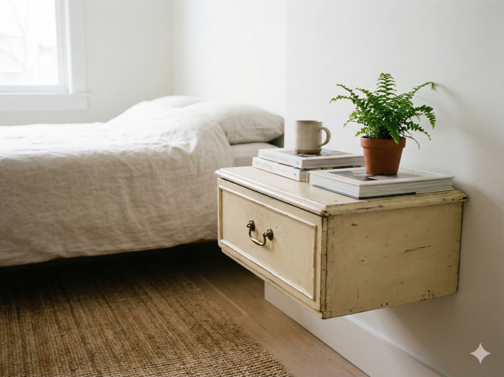 Thrift stores, garage sales, and online marketplaces have great nightstand options for cheap. Look for floating shelves, small wall-mounted cabinets, or even decorative brackets and boards you can combine.