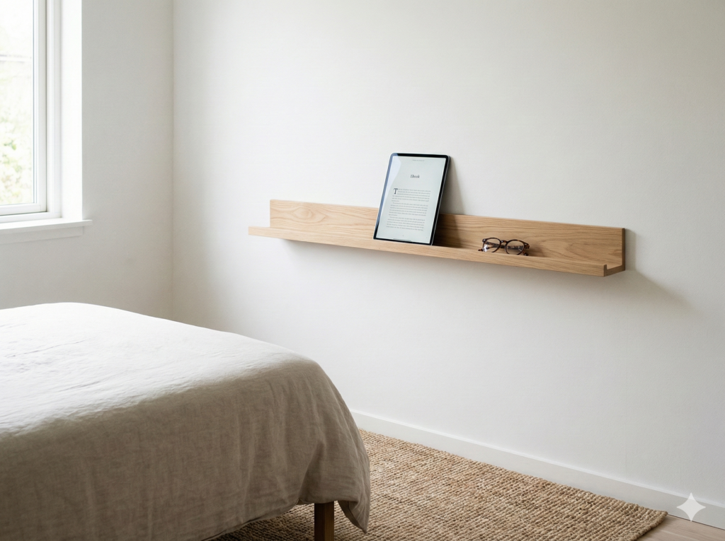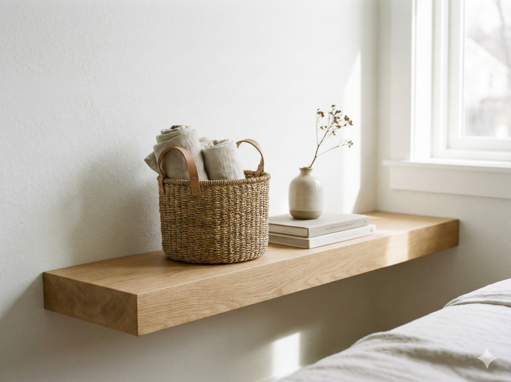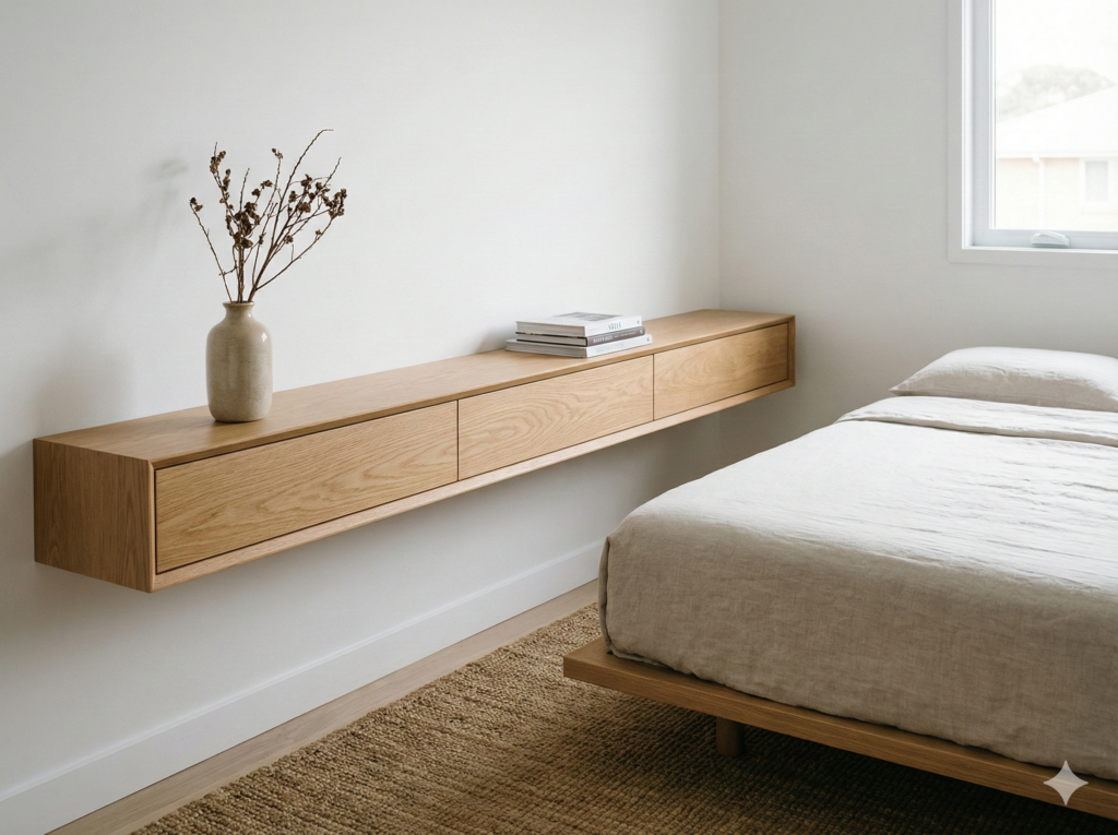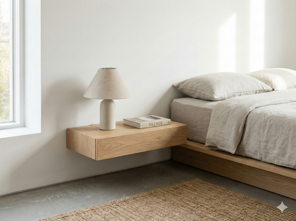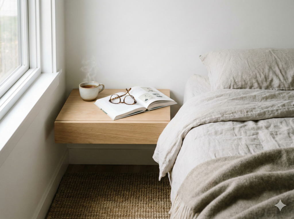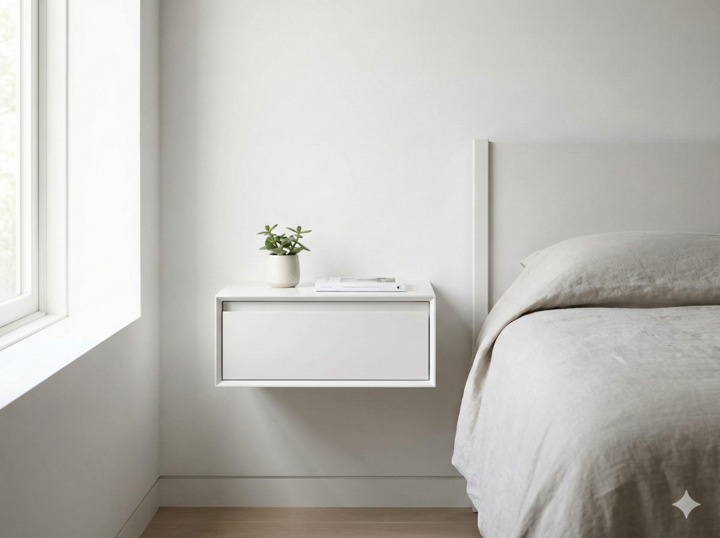Floating nightstands are wall-mounted shelves or small tables that hang on your bedroom wall instead of sitting on the floor. They’re perfect for small bedrooms because they save floor space, make your room look bigger, and give you a spot for your phone, lamp, and bedtime book.