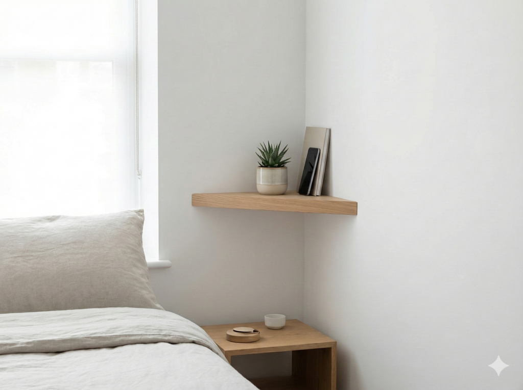 If your bed sits in a corner or your room has an odd shape, corner shelves are your best friend. They use space that would otherwise go to waste. Triangle-shaped corner shelves fit perfectly in that awkward spot.