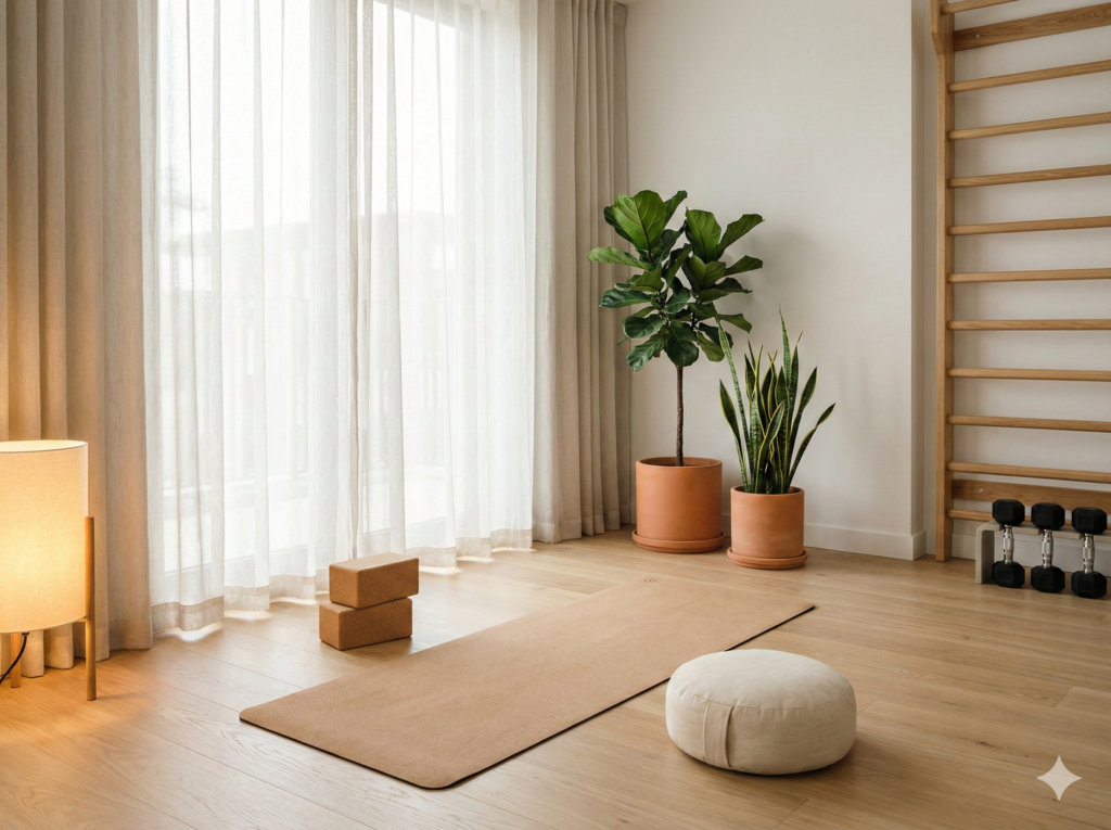 Wood tones, plants, and soft colors. Natural gyms feel peaceful and grounding.