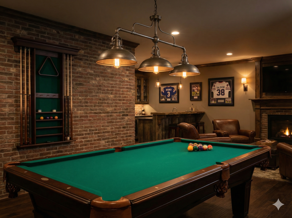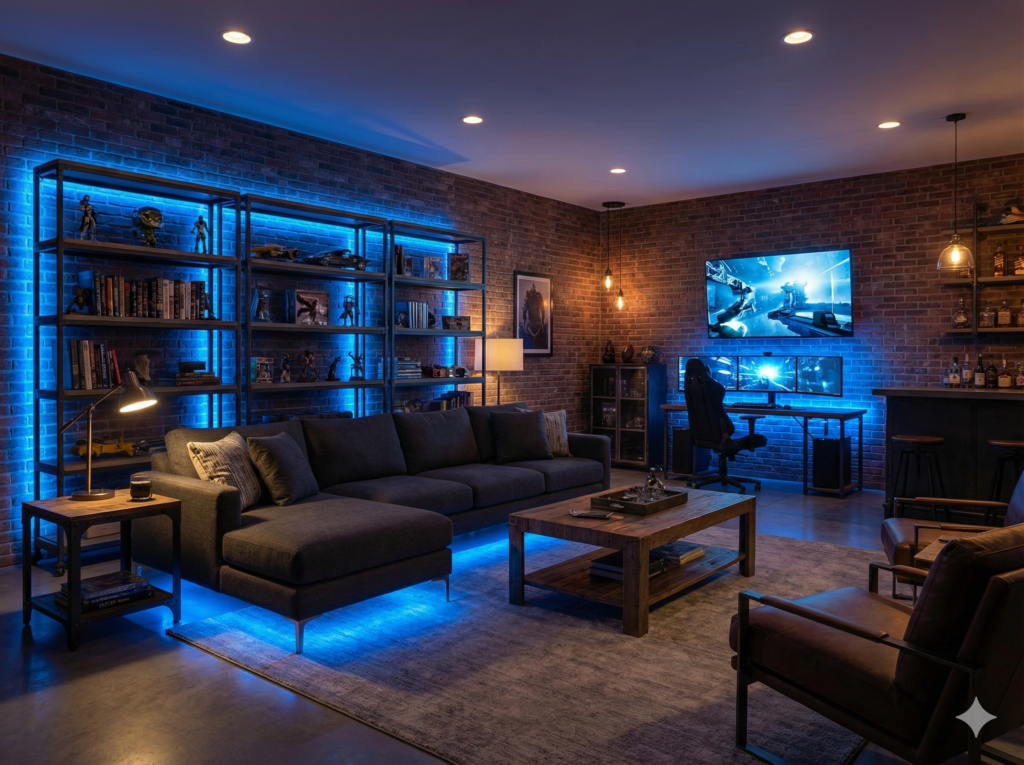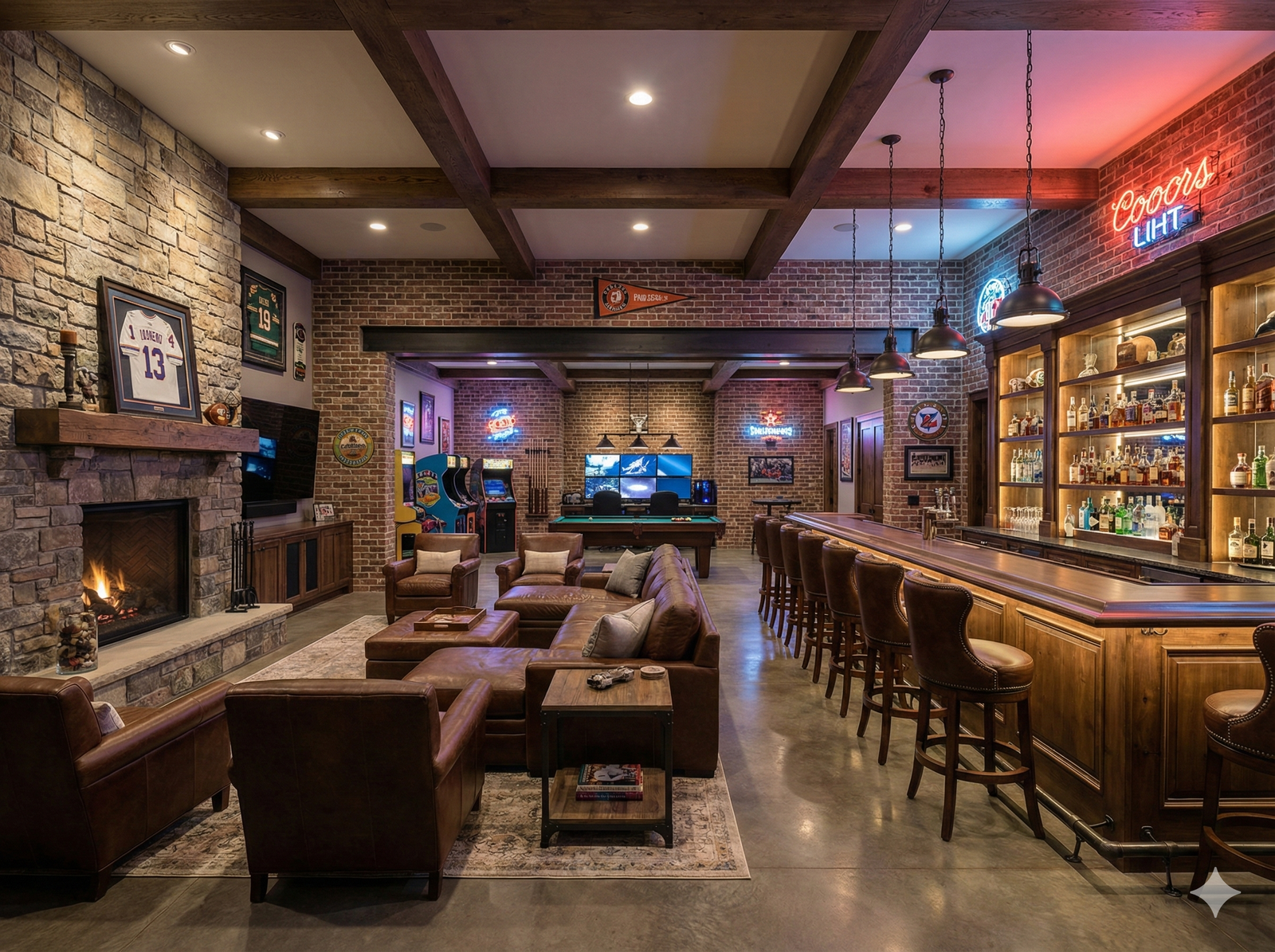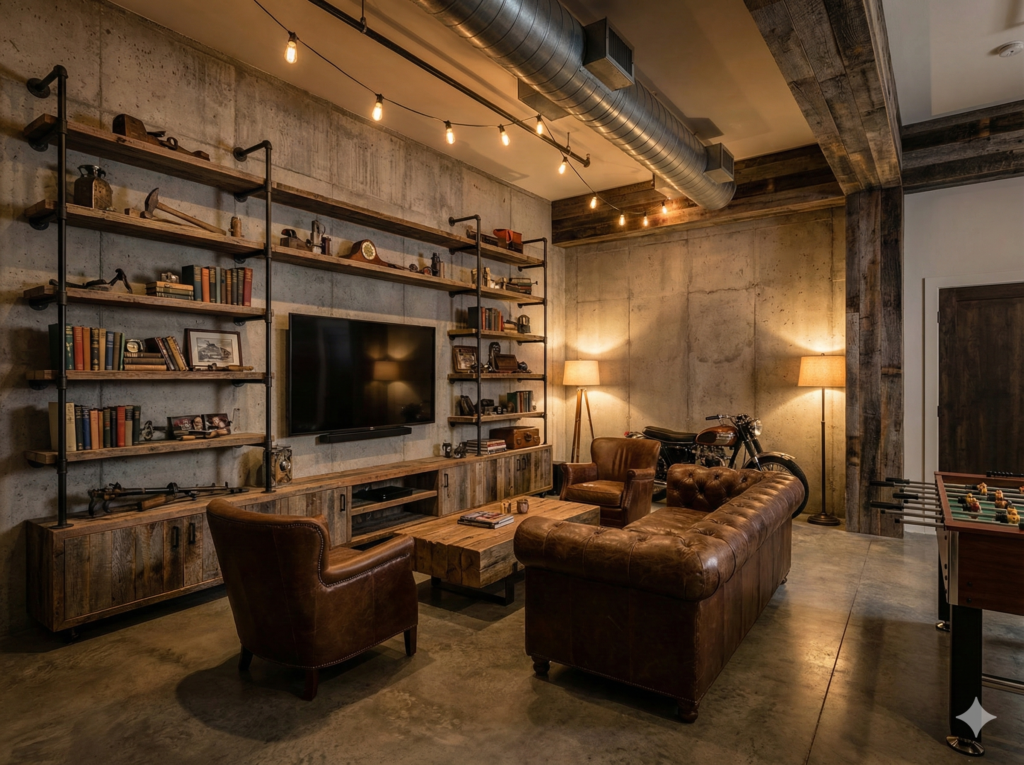 This style uses raw materials like wood, metal, and exposed brick. It gives your man cave a rugged, masculine feel.