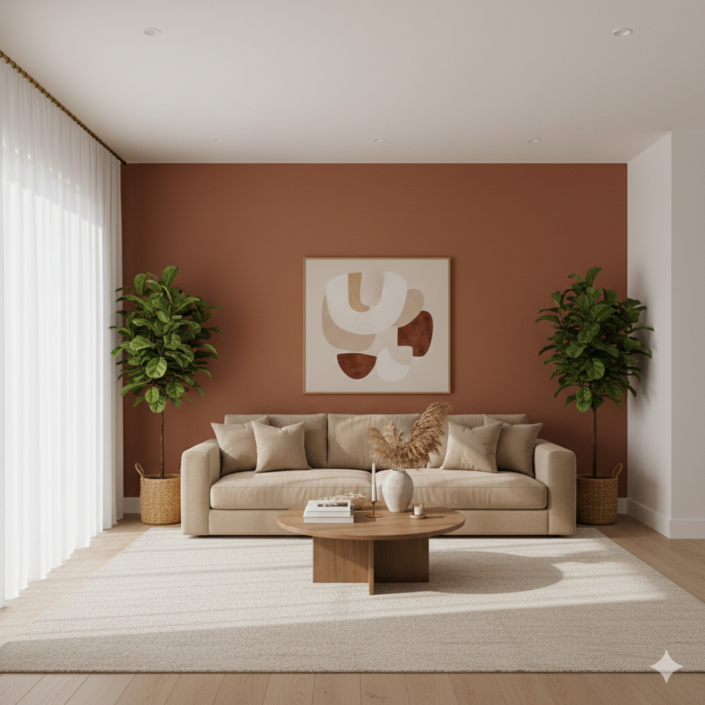 Living RoomWarm terracotta, neutral, soft blueWelcoming, warmAccent wall or color-blocking