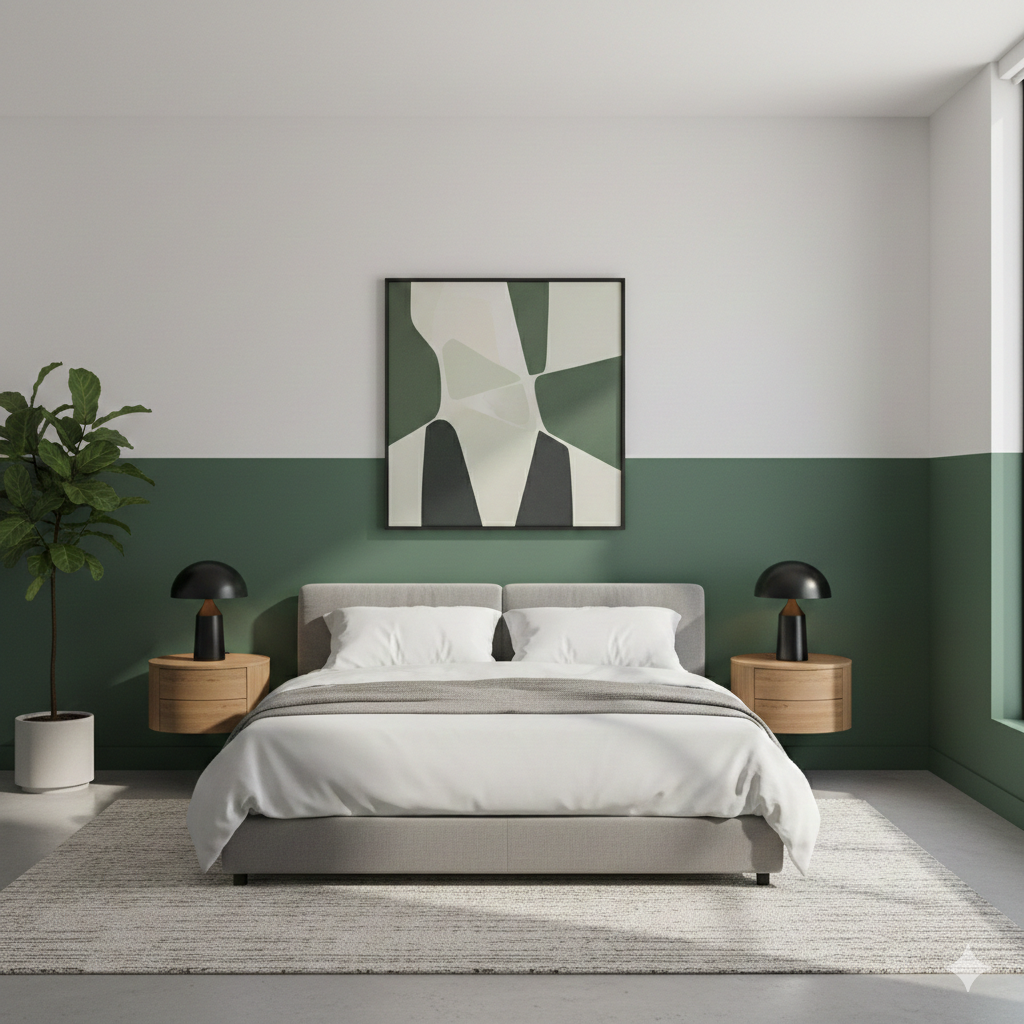 Color-Block Accent Wall: Choose two colors that go well together (like navy and cream, or sage green and white). Paint large geometric blocks on one wall for a modern, stylish look.