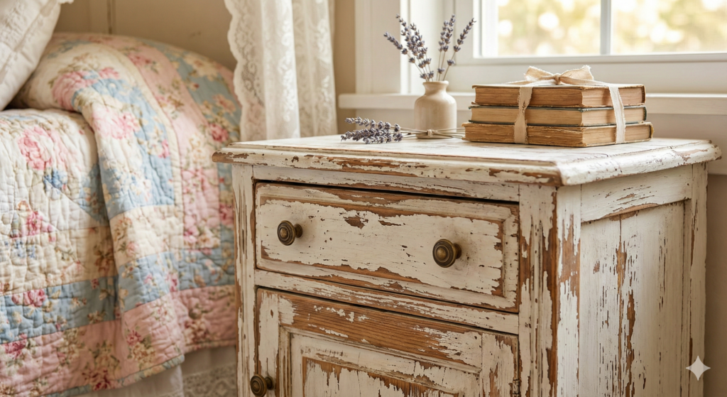 If you find a solid piece that’s in decent shape, you can make it look distressed yourself. Paint it with pastel colors, then sand or distress the edges so the older finish shows through underneath. This makes it look like it’s been loved for years, even if it’s brand new.