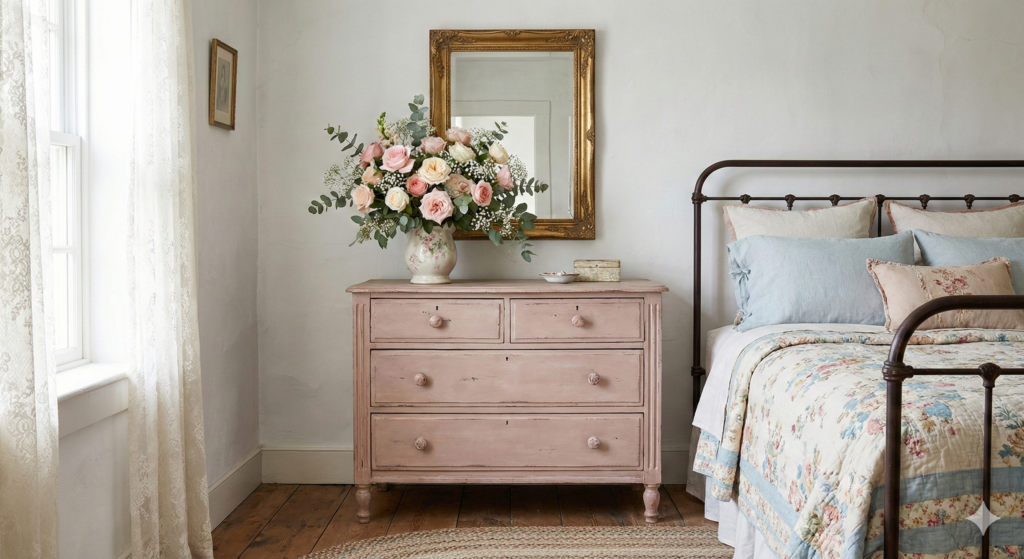 One of the best parts of shabby chic is that it’s okay to not match. A wrought iron bed pairs beautifully with wooden nightstands. A painted Hungarian chest can sit right next to a fancy Italian dresser. This mix of styles creates character and keeps the room from feeling boring.