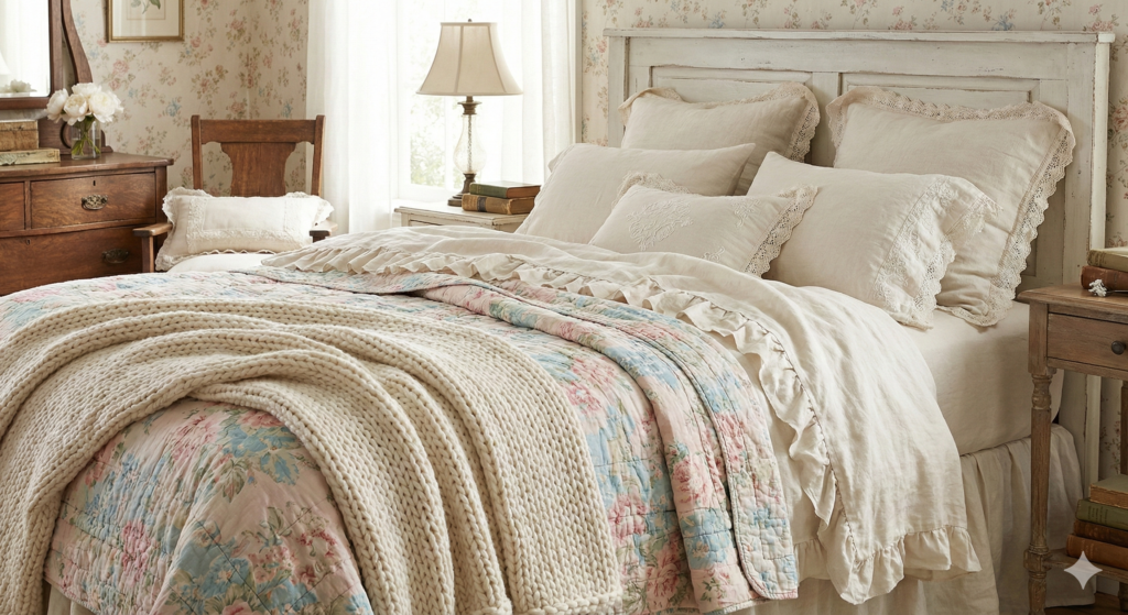 Linens and textiles bring shabby chic to life more than anything else. This is where you layer softness and tell your bedroom’s story.