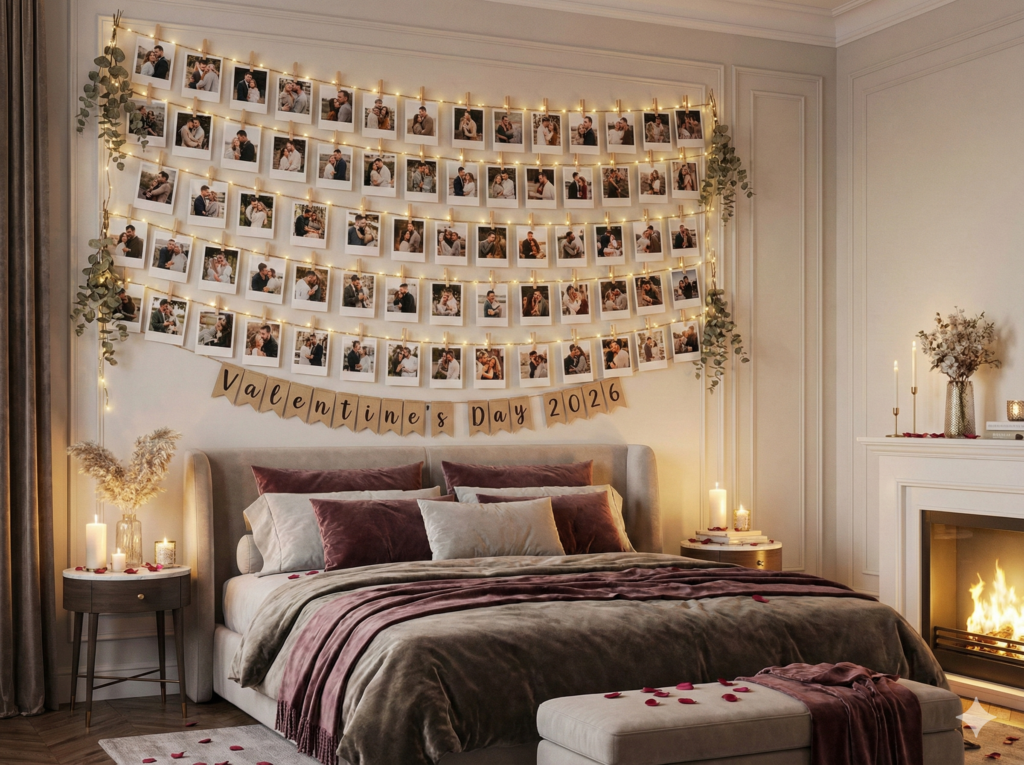 Print favorite photos of you and your partner. Hang them on string with mini clothespins. This creates a memory wall that’s personal and touching. Add fairy lights around the photos for extra glow.